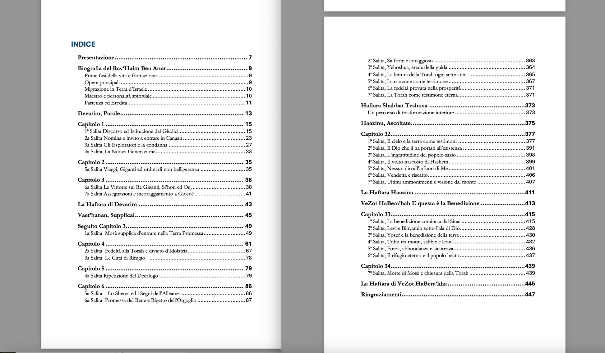 Tra i suoi allievi si annovera il giovane Ḥaïm Yosef David Azulai (ḤIDA), allora sedicenne, che sarebbe divenuto Rabbino Capo del Cairo e di Livorno. In questo ultimo volume sul Deuteronomio, il commentario dell’Or HaḤayyim rivela un messaggio di speranza, alleanza eterna e risveglio spirituale, fondato sull’amore divino e sulla promessa di ritorno.